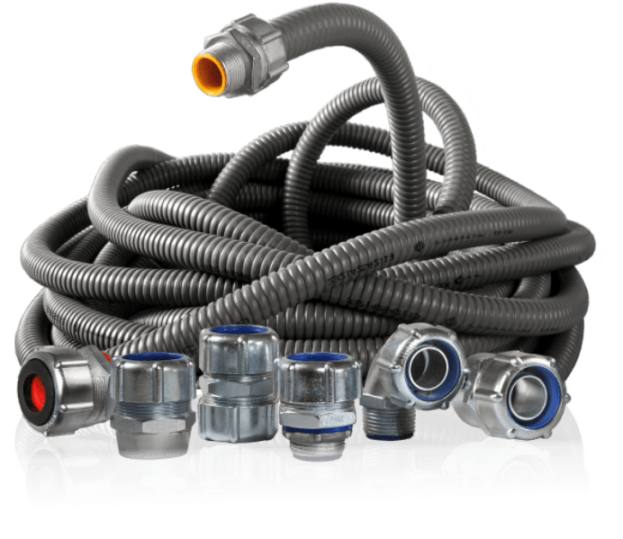 La amplia gama de conectores es de construcción metálica (En inyección de Zamak o Acero galvanizado según el caso) y el sistema alcanza un grado de protección IP65 en la conexión con los diferentes caños flexibles. La misma se logra mediante un robusto anillo de sello y un interior metálico de diseño especial que penetra en el interior del flexible mediante atornillado, asegurando la continuidad eléctrica entre el caño y el cuerpo del conector, al tiempo que otorga al conjunto resistencia mecánica a la tracción, y brinda una superficie sin bordes agudos que pueda dañar los cables. Todos los conectores están disponibles para los tres tipos de caños flexibles. Los conectores para el flexible MF o MFH son identificables por el anillo y aislación color azul. Los conectores para el caño extra flexible EF, son identificables por el anillo y aislación color amarillo.