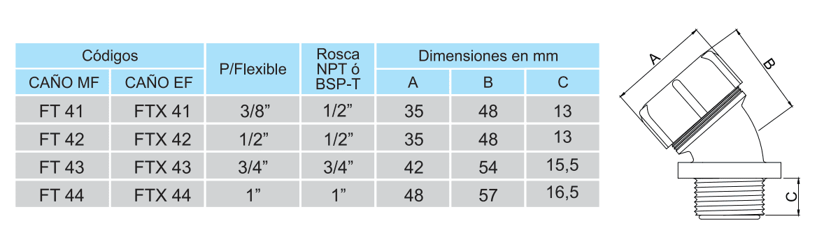 El conector Argeflex curvo a 45° FTX para caño extraflexible Argeflex EF es utilizado para unir caños extraflexibles con cajas de paso, cajas de derivación, motores, tableros, etc. La salida de los cables se produce en un ángulo de 45° respecto al sentido de conexión del caño extraflexible. Por su diseño reúnen los requisitos necesarios para una excelente conexión estanca, alcanzando un grado de protección IP 65. La misma se logra mediante un robusto anillo de sello y un interior de zamak de diseño especial que penetra en el interior del flexible mediante roscado, asegurando la continuidad eléctrica entre el caño y el cuerpo del conector, al tiempo que otorga al conjunto resistencia mecánica a la tracción y brinda una superficie sin bordes agudos que pueda dañar los cables. Son construidos en inyección de Zamak. Certificados bajo norma IEC 61386.