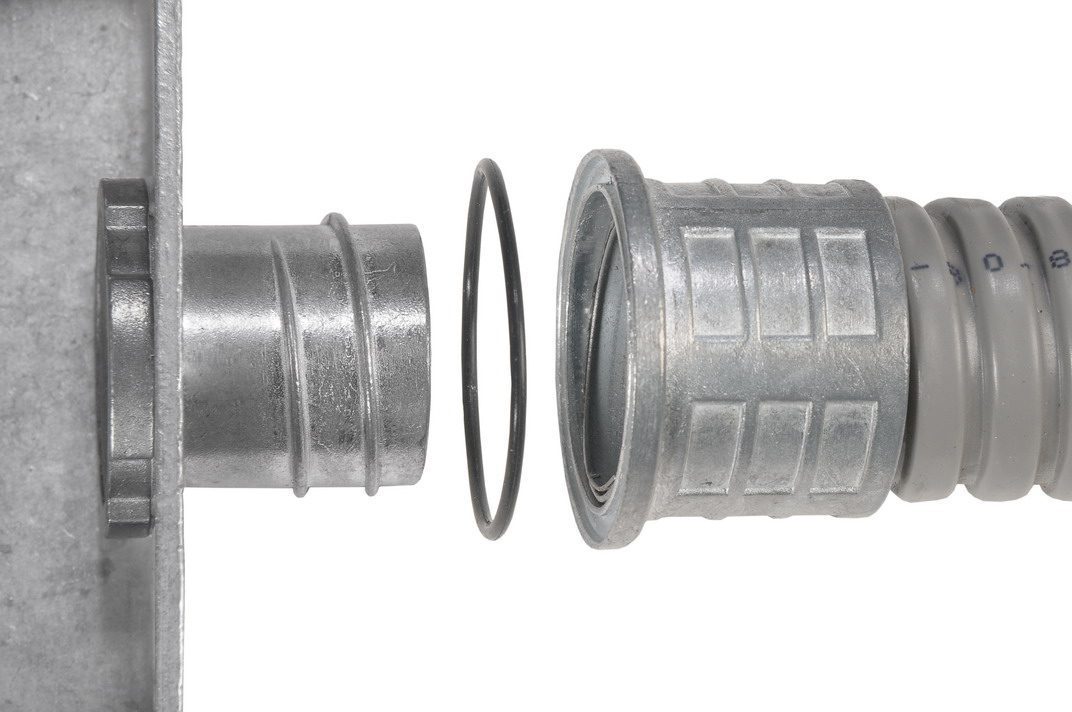 2. colocar el anillo de sello sobre el alojamiento mecanizado en el extremo del cuerpo exterior del conector ya colocado sobre el caño.