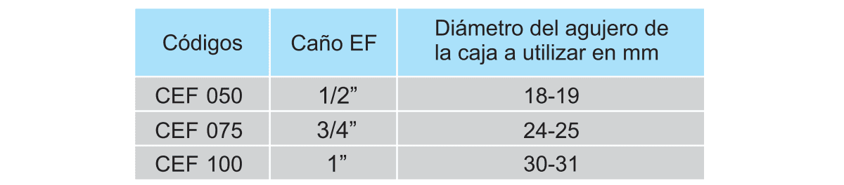 – Al realizar agujeros en cajas o gabinetes, deben tener el diámetro indicado en la tabla de selección.