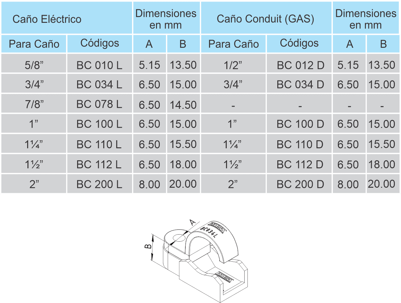 La abrazadera Daisa BC 112 D es fabricada en aleación de aluminio y silicio por inyección, que le otorga excelentes propiedades mecánicas y resistencia frente a la corrosión. Se utiliza como elemento de fijación y soporte para caños rígidos tipo conduit (DIN 2440 / Gas) de 1 1/2″. Se fija en un solo punto, dando la altura exacta para la entrada a las cajas, aún cuando se utilicen distintos diámetros o tipos de caño. Está certificada según norma IRAM 62386.