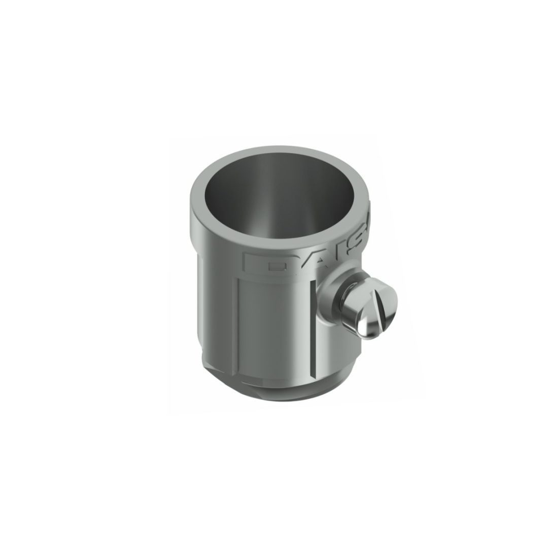 El conector cuenta con dos agujeros para colocar el tornillo de fijación del caño, de manera tal de que el instalador utilice aquel que sea mas accesible luego de roscar el conector a la caja Daisa. Luego de permitir el ingreso del caño, ajustar el tornillo.