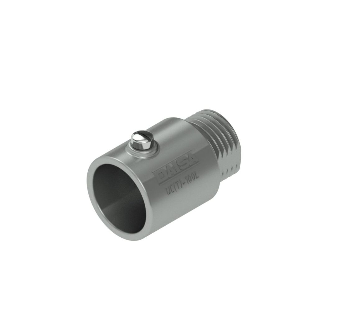 El conector para caja estándar Daisa UC 110 L es fabricado en aleación de aluminio por inyección, que le otorga excelentes propiedades mecánicas y resistencia frente a la corrosión. Se utiliza para la acometida de cajas, gabinetes, tableros, etc. que no posean agujeros roscados. Se provee con tornillo fabricado en acero al carbono con cobertura de galvanizado Dacromet, especialmente diseñado para clavarse en la cañería impidiendo que esta se desprenda. Utilizado en conjunto con caños Daisa KSR o KSRV y curvas Daisa KSC, la continuidad eléctrica del sistema queda garantizada porque mas de un tercio de la superficie del accesorio queda en contacto con la superficie del caño. Es compatible con caños rígidos y curvas Daisa de 1 1/4″ y cajas Daisa de 1″ . Están certificadas bajo norma IEC 61386 / IRAM 62386.