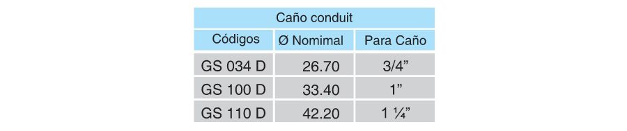 La abrazadera rápida para pared Sisagrip GS es utilizada en la fijación de caños, cables, mangueras, etc. Son construidas con fleje de acero galvanizado por inmersión en caliente. La base de la abrazadera cuenta con orificio para fijación, mientras que la cuña o grampa de la abrazadera tiene forma cónica con muesca de seguridad. Toda la línea de abrazaderas GS D es compatible con caños conduit (DIN 2440 – Gas) y puede ser utilizada con caños rígidos conduit o caños flexibles Argeflex. Certificadas bajo norma IEC 61386.